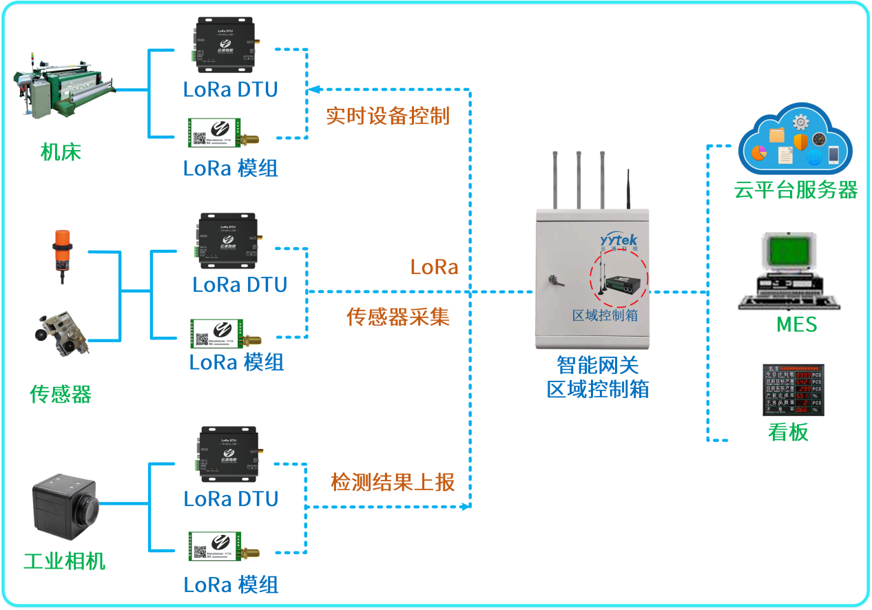 在工廠內(nèi)的各個終端節(jié)點(傳感器、工業(yè)設(shè)備、工業(yè)相機)使用LORA DTU和LORA模組升級設(shè)備和傳感器,使設(shè)備具備無線傳輸能力,實現(xiàn)對生產(chǎn)數(shù)據(jù)的實時上報和操作指令接收。通過云涌智能無線網(wǎng)關(guān)對著這些終端節(jié)點進(jìn)行數(shù)據(jù)的采集和接收,再由網(wǎng)關(guān)進(jìn)行數(shù)據(jù)分析和協(xié)議轉(zhuǎn)換,與上層的不同業(yè)務(wù)系統(tǒng)進(jìn)行數(shù)據(jù)的交互。