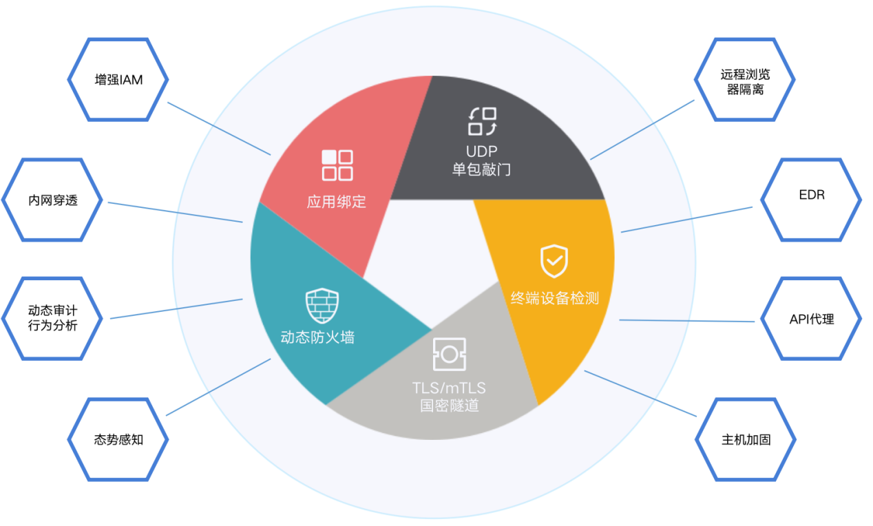 ? ? ? 本方案融合了當(dāng)前最新的安全技術(shù)通過聯(lián)動的安全矩陣設(shè)計,形成一個整體的安全閉環(huán)。安全矩陣主要包括:SDP安全框架,遠(yuǎn)程瀏覽器隔離,增強(qiáng)IAM, 端點檢測與響應(yīng)EDR,邊緣微隔離,內(nèi)網(wǎng)穿透,動態(tài)審計與行為分析,態(tài)勢感知,API代理、主機(jī)加固與可信計算。