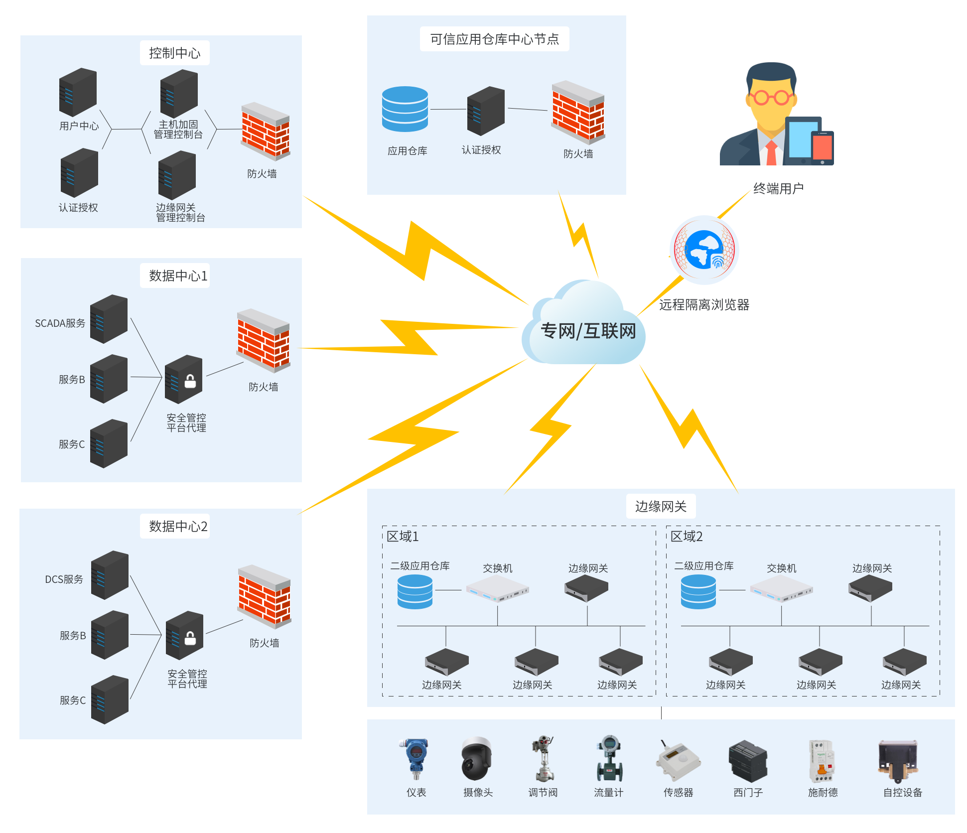 ? ? ? 通過建立中心和二級分布式的應(yīng)用倉庫節(jié)點,保證設(shè)備升級和部署的應(yīng)用程序供應(yīng)鏈安全。所有應(yīng)用上傳后均通過EDR進(jìn)行惡意木馬病毒掃描,保障了邊緣網(wǎng)關(guān)安裝應(yīng)用的安全性。中心化的管理保證數(shù)據(jù)安全的同時還能簡化管理的成本和工作量。