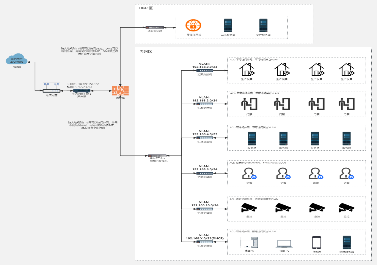 ? ? ? 其次,為了解決內網安全隱患,根據業務類型和部門劃分不同的VLAN,各VLAN之間的通過ACL策略進行合理的訪問控制。同時建立DMZ區,DMZ區用來放置必須公開的服務器資源(如企業Web服務器、文件服務器、論壇等)和零信任網關,外網、DMZ和內網之間通過防火墻進行隔離。